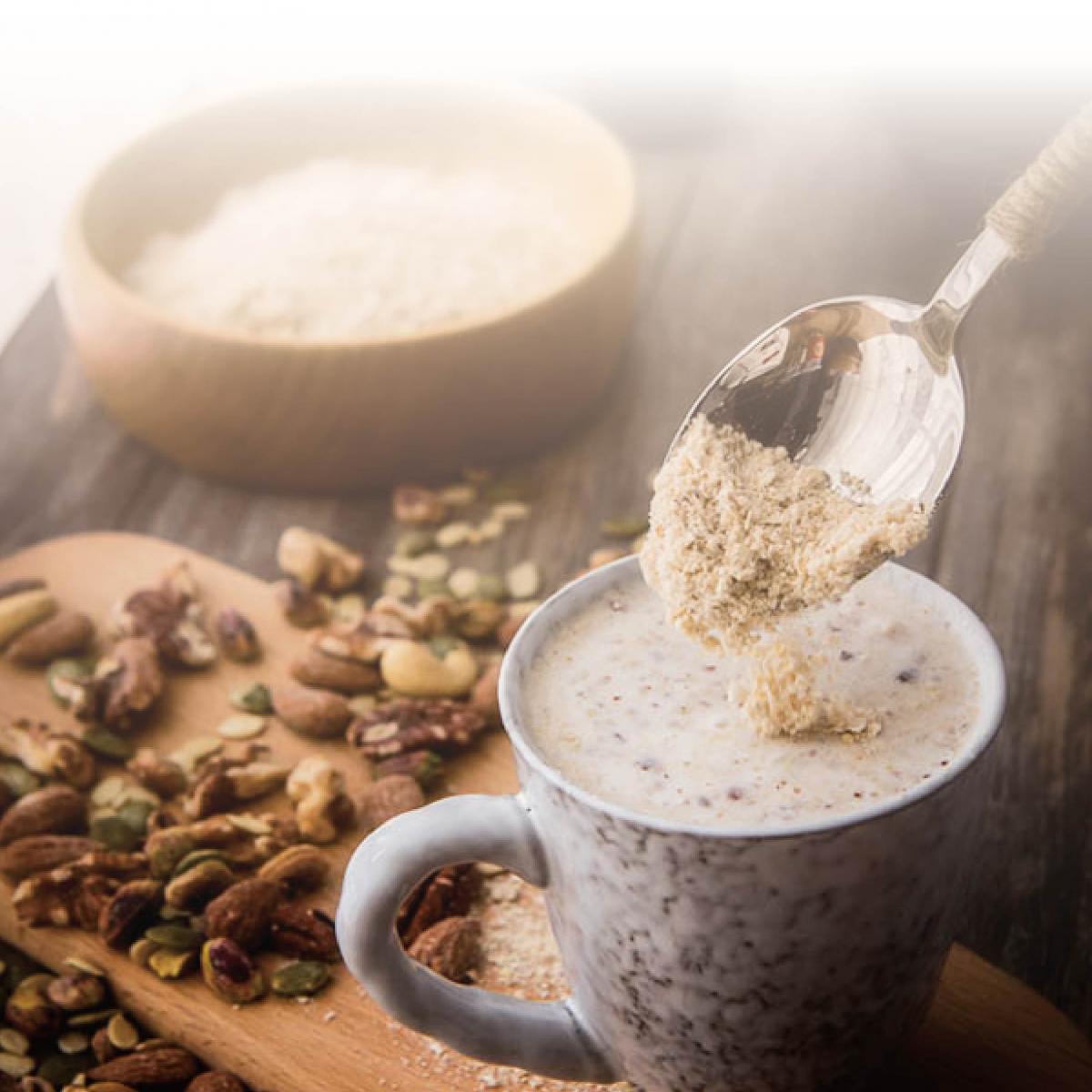 - 300c.c.的熱水加入30公克的堅果穀粉,可依個人口味調整!也可搭配豆漿、鮮奶…等做變化。