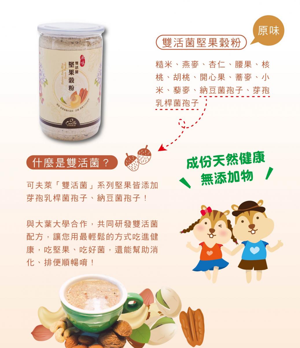 成分天然無添加糖!保留堅果及穀類原味!絕不添加麥芽糊精、膠類及修飾澱粉,方便快速補充堅果及穀類的營養。可夫萊堅果穀粉堅持使用新鮮天然原料,透明化包裝、看得到的健康!希望顧客品嚐到真正食物味道的感動。