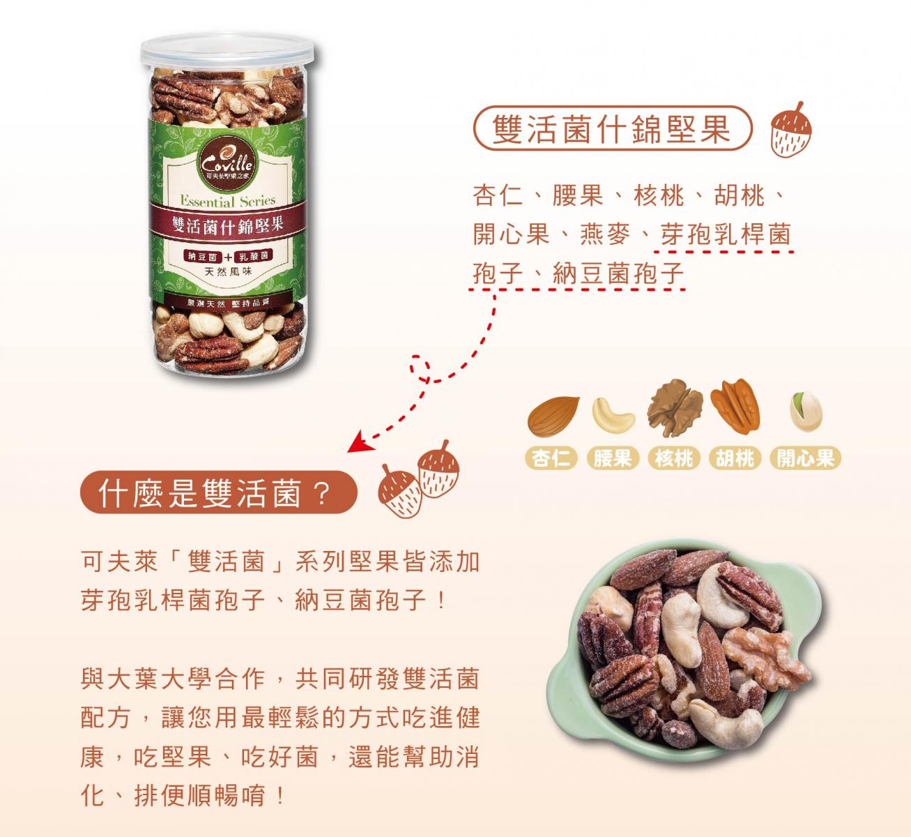 - 雙活菌什錦堅果:添加獨家「雙活菌」配方,吃堅果、吃好菌,還能幫助消化、吃了不會脹氣唷!