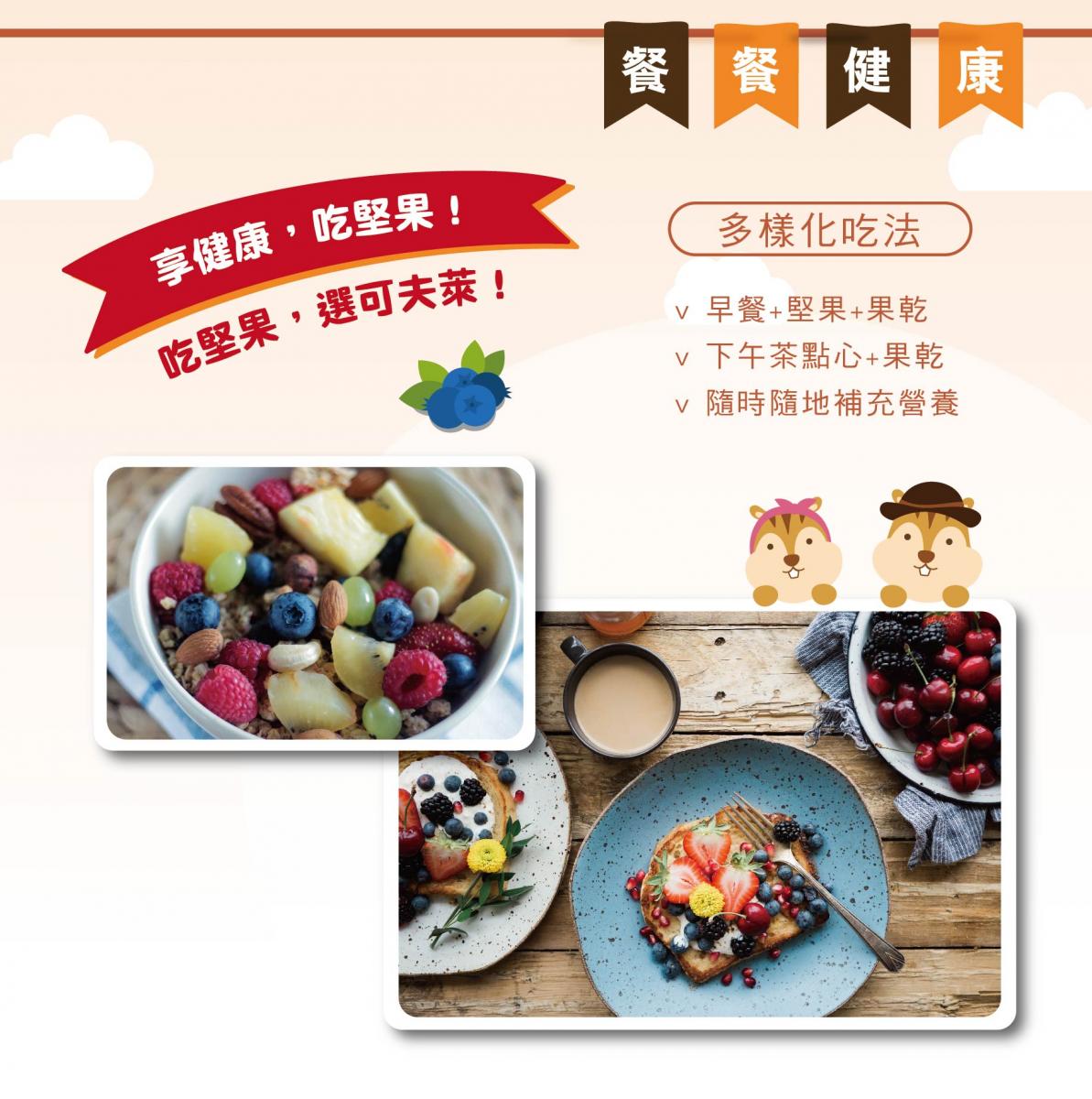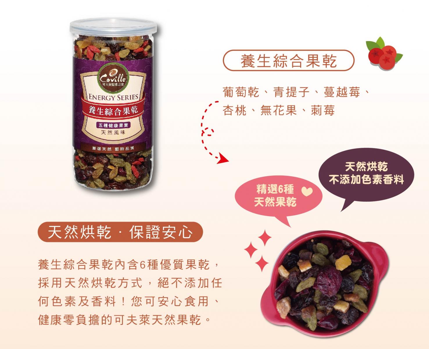 - 養生綜合果乾:精選6種優良果乾,風味獨特,可添加在沙拉或早餐穀片中一起食用,增加口感變化。