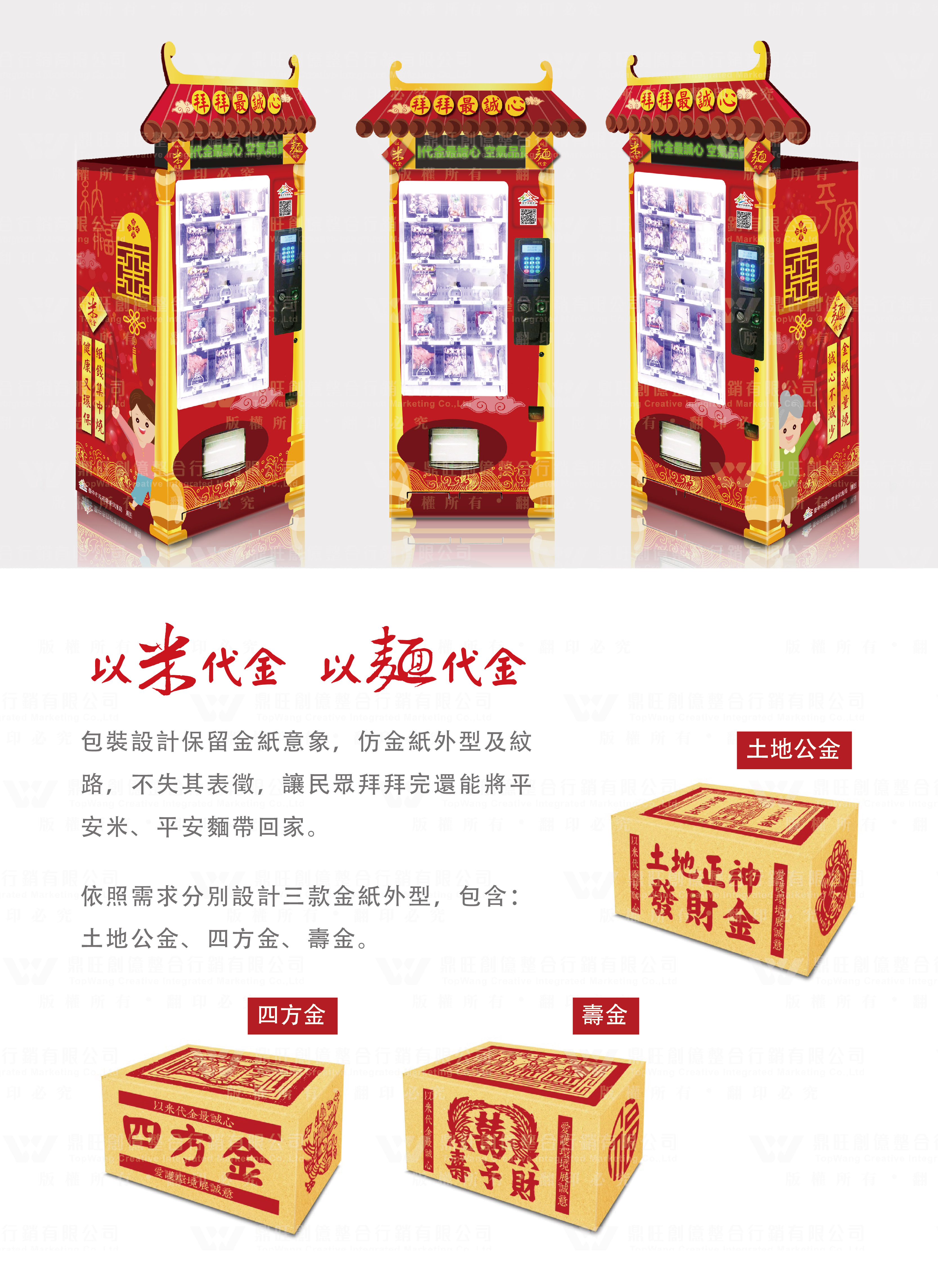 精選案例 Works 以麵(米)代金 與臺中市政府環境保護局合作,希望民眾前往廟宇祈求平安的同時也能注重環保,「以麵(米)代金」販賣機因而誕生。 ▌異業結合 ▌以麵(米)代金販賣機 ▌販賣機外型設計/商品包裝設計 ▌2017 ▌「以米(麵)代金 拜拜最誠心」宮廟造型販賣機,結合生動活潑、貼近人心的插畫,除了希望減少空氣污染外,更可望吸引老少信眾並帶動人潮!此專案為降低民眾到宮廟拜拜焚燒金紙所造成的環境空污問題,延續104年度臺中市政府環境保護局以麵代金示範專案,特製作三台以米(麵)代金販賣機。 ▌商品部分與國內米、麵食業者配合,推出平安米、平安麵。選用「無農藥耕作的福佑米」及「非基因改造非油炸麵」。 ▌宮廟文創-宗教文創設計、開發、試模、打樣、成品,一條龍專業服務