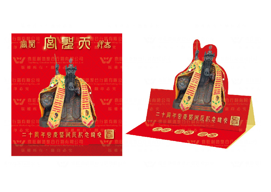精選案例 Works 豐原天聖宮天師府二十年宮慶暨誕辰紀念錢母 ▌豐原天聖宮天師府 ▌錢母設計 ▌2018 ▌豐原天聖宮天師府創立於1998年,幸逢至今年餘20周年,我們為天聖宮張府天師設計一款專屬又特的的紀念錢母,並邀請各友宮蒞臨參拜,結合義診與義剪活動幫助信眾、活絡當地。 ▌宮廟文創-宗教文創設計、開發、試模、打樣、成品,一條龍專業服務