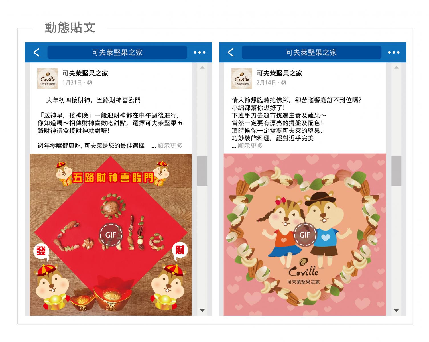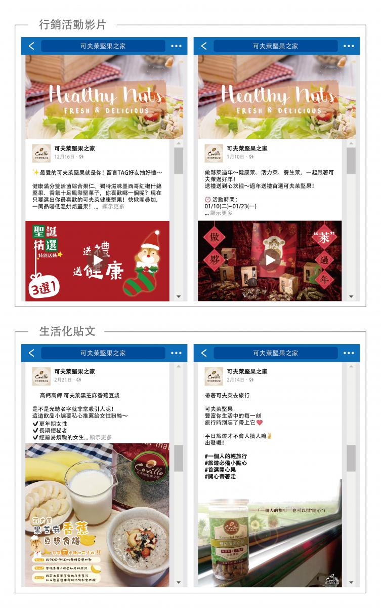 精選案例 Works 可夫萊堅果 粉絲專頁經營 採用真正低溫烘焙堅果的業者,自行吸收不見的時間成本。除了推出不同種類堅果,於口味上也有豐富的變化,更添加獨家雙活菌,幫助消化。 ▌可夫萊 ▌低溫烘焙堅果 ▌facebook粉絲專頁/Line@生活圈經營/短片拍攝製作/情境照 ▌2016-2017