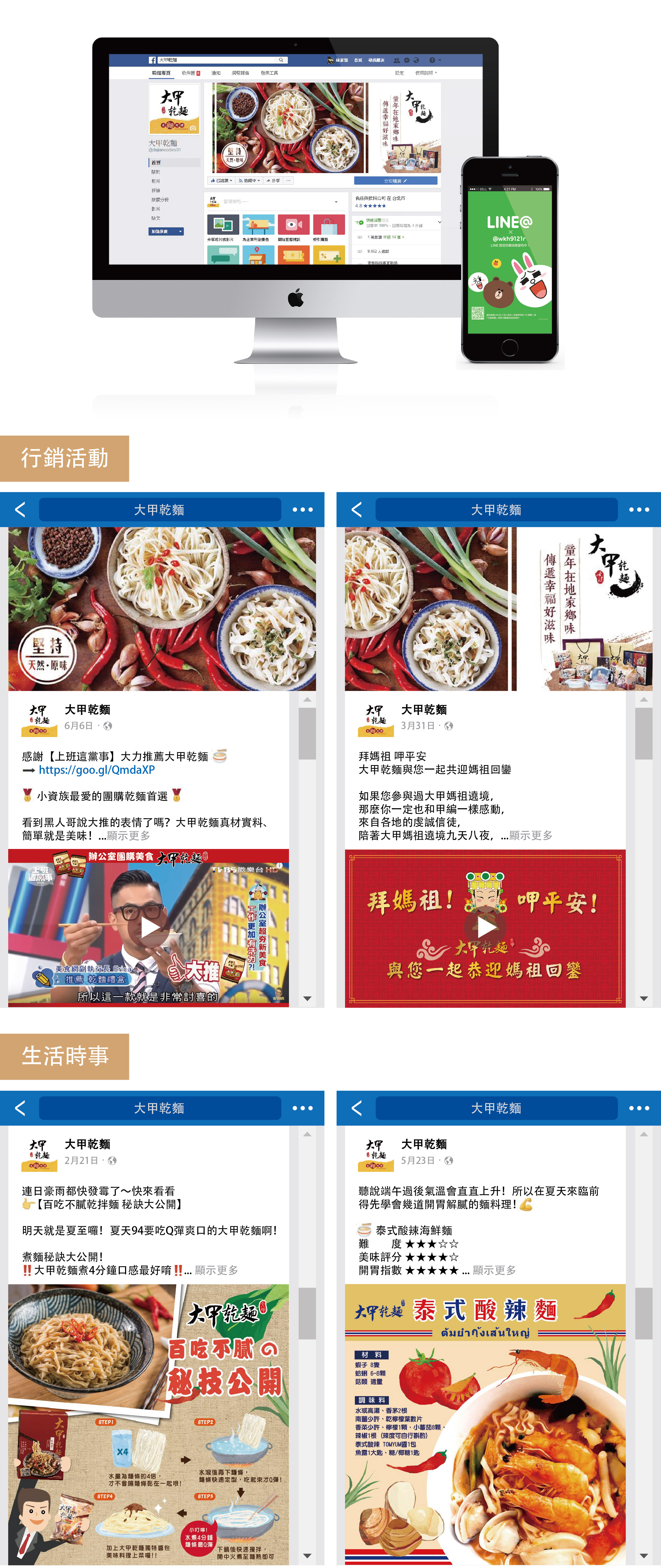 精選案例 Works 大甲乾麵 粉絲專頁經營 所有麵條均為非基因改造、非油炸麵、低鈉低卡無鹽麵體,讓人回味童年在地的家鄉味道,傳遞幸福的好滋味。 ▌智優國際 ▌大甲乾麵 ▌facebook粉絲專頁/Line@生活圈經營/短片拍攝製作/情境照 ▌2016-2017