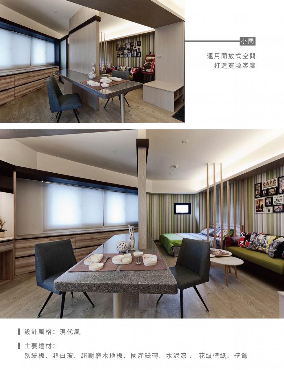 主要建材 | 系統板、超白玻、超耐磨木地板、國產磁磚、水泥漆 、 花紋壁紙、壁飾