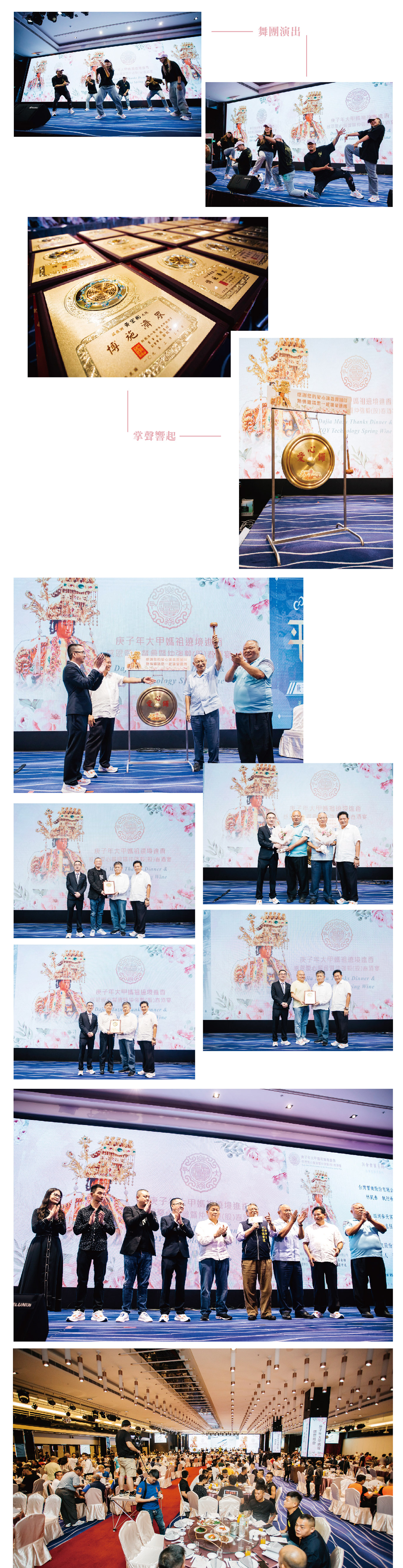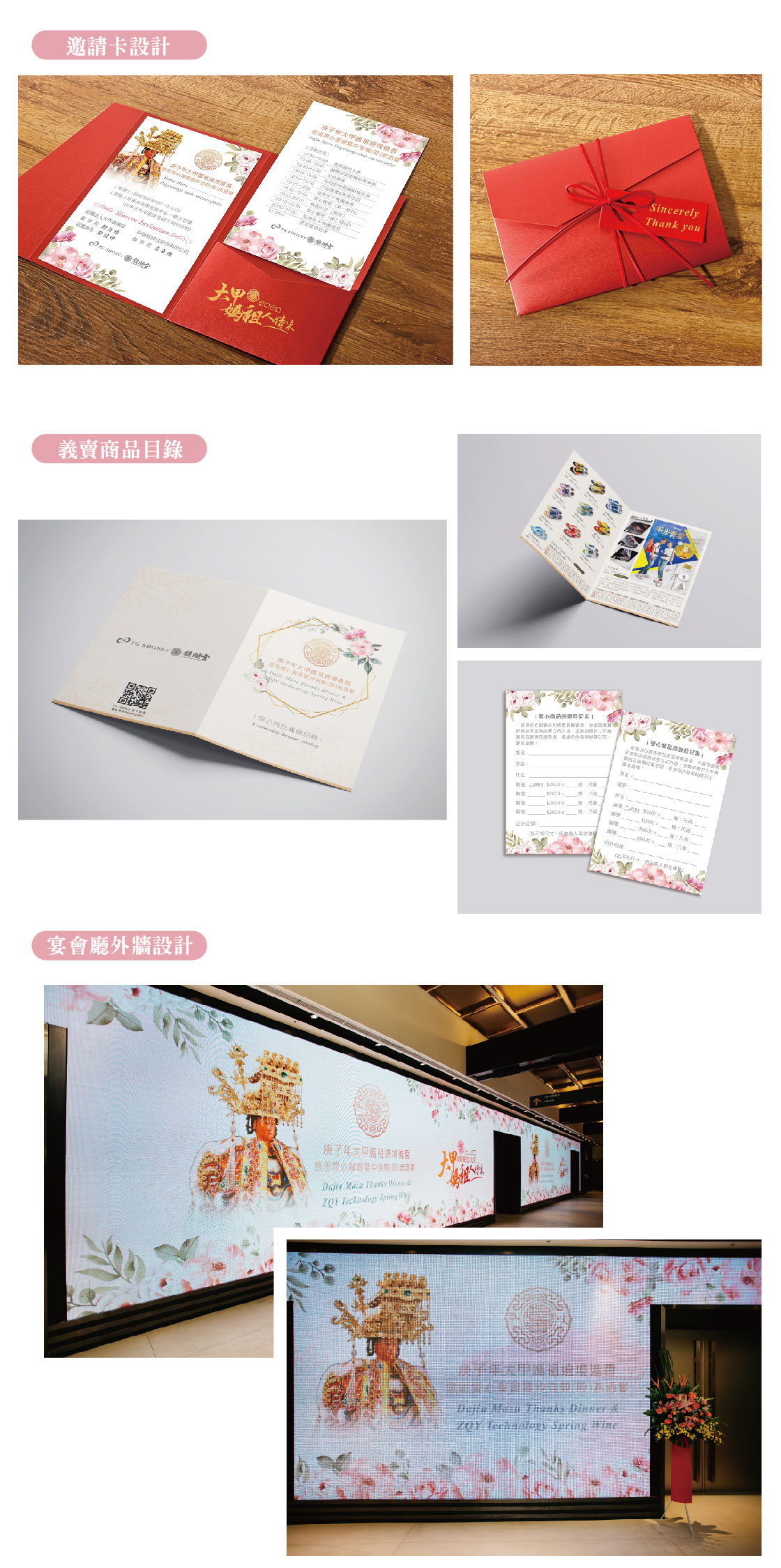 精選案例 Works 庚子年大甲媽祖遶境進香 感恩愛心餐會暨仲強毅(股)春酒宴 ▌PG SHOES x 鎮瀾宮 ▌好運來宴展中心 ▌文宣設計/活動企劃/場地規劃/會場佈置/樂(舞)團演出/燈光音響/活動攝(錄)影 ▌2020 ▌專業一條龍活動企劃服務 從周邊文宣品設計印刷、活動企劃、場地規劃、會場佈置、燈光音響、活動攝影(錄影)及其繁雜的事項溝通協調,專人服務,值得所託。